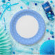 El diseño de esta sala circular festiva se compone de un gran círculo blanco central con una banda ancha de llanta azul pastel con pequeños puntos de polka blanco enlosado.