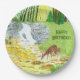 Placas de papel con una hermosa escena forestal incluyendo doe y fawn bebiendo de un arroyo cerca de una cascada. Obra de arte original de W.B.