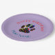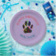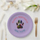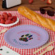 A puppy paw print covered with confetti and streamers. Custom paper plates for parties.