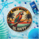 Don't Worry, Be Happy" Round Wooden Plaque featuring Tropical Parrot Art.