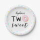 Cute tema de donut plato de papel para la fiesta de cumpleaños de un niño con rociadores y un texto de tipografía que dice "dos dulces" con un rosquero rosa y blanco en el medio. Personalizar este producto agregando el nombre de su hijo. Genial para un segundo cumpleaños de un chica.