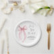 Platos de papel elegantes para ducha de novia con una acuarela de un lazo coqueto rosa claro, "Ella está atando el nudo" en letra de caligrafía, y el nombre de la novia y la fecha de la ducha en letra moderna simple.