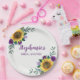 Estas placas de ducha de matrimonio personalizadas presentan un diseño floral moderno con girasoles acuarelas y flores violetas. Personalizarlos con el nombre de la novia.