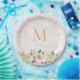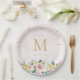 Platos de papel para fiesta de novia con elegante ramo floral rosa rústico con inicial personalizada.