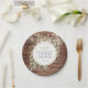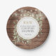 Con hermosas luces de cuerda y delicadas hojas de vegetación de acuarela sobre un fondo de madera rústica, estos platos de papel para ducha de parejas botánicos chic pueden ser personalizados con las iniciales de su monograma y detalles especiales de la ducha de parejas. Diseñados por Thisisnotme