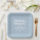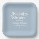 Los elegantes platos de fiesta de papel casero personalizados presentan un moderno guión de caligrafía "Bridal Shower" con acento cardíaco adorable. Personaliza con el nombre de la novia y el nombre de la futura señora quien honra el evento. Diseño limpio y sencillo. Hay que destacar que se puede modificar el esquema de color azul y blanco polvoriento.