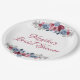 Estos platos de papel bonitos se coordinan con toda la Colección de Boda Azul Polvo y Burdeos. Un ramo de rosas azules, rosadas y burdeos con botánicos grises está en la parte superior e inferior de estos platos. En el medio puedes personalizar con el nombre de la novia. Estos son perfectos para servir almuerzo, pastel o golosinas en su baby shower.