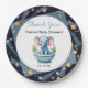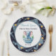 Un plato de papel decorativo con un diseño de temática espacial, perfecto para una ducha de bebé gracias a la celebración.