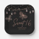 Sweet 16 Rosa Moda de mariposa dorada Modern Birthday Paper Fiestas Plates presenta elegantes mariposas rosas de oro con luces de cuerda sobre un fondo negro con Sweet 16 en un elegante guión caligráfico y personalizado con su nombre y fecha a continuación. Personalice editando el texto en los cuadros de texto. Diseñado por ©Evco Studio www.zazzle.com/store/evcostudio