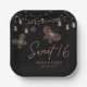 Sweet 16 Rosa Moda de mariposa dorada Fiesta de papel de cumpleaños moderna Las placas presentan elegantes mariposas de rosa de oro con luces de cuerda sobre un fondo negro con Sweet 16 en un elegante guión de caligrafía con "Feliz cumpleaños" y personalizadas con su nombre personalizado a continuación. Personalice editando el texto en los cuadros de texto. Diseñado por ©Evco Studio www.zazzle.com/store/evcostudio