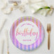 "Feliz 16 cumpleaños". ¡Aquí hay una adición única a su fiesta de cumpleaños! Utilice este impresionante, moderno, diminuto y brillante confetti azul turquesa imitación de puntos purpurinas y el guión amarillo rosado naranja púrpura de tipografía oscura contra un fondo rayado purpurina rosa claro y arcoiris oscuro, placa de papel para un evento que recordar. Personalice el texto del personalizado con el nombre de su invitado de honor. Su elección de 2 tamaños: 7" o 9". ¡Garantizado para darle un toque de gracia a su fiesta especial! En esta moderna y especial colección también se ofrecen invitaciones, servilletas y otros artículos de cumpleaños. Simplemente teclee el nombre del chica de cumpleaños y puede personalizar fácilmente este plato de papel. Por favor, envíame cualquier pregunta o petición.