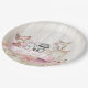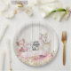 Platos de papel para fiesta de bebé niña con adorables animales del bosque en un fondo rústico de madera y pancarta floral rosa. Estos platos para fiesta de bebé del bosque se pueden personalizar fácilmente para su evento agregando el texto que desee.