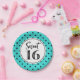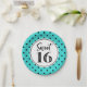 Dulces platos de fiesta de 16 años con un patrón de puntos de polka blanco y negro turquesa.