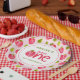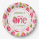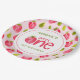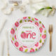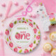 Papel de primer cumpleaños de fresa dulce de un día de fresa Placas con fondo de color rosa ondulado.