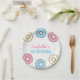 Es un "dulce uno" Donut fiesta de cumpleaños de papel redondo. Tiene rociadores de color pastel y donuts bonitos y dulces. Perfecto para la celebración de la fiesta de cumpleaños de las niñas pequeñas. Tiene un divertido texto de guión de tipografía y todo el texto aquí es fácilmente personalizable. Mejor para los niños temáticos de Donut 1er cumpleaños.