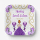 Este dulce plato de dieciséis platos tiene un marco dorado elegante, una bella princesa con el pelo rojo y un vestido púrpura, flores y un globo. Es perfecto para una dulce fiesta de 16 años.