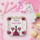 Este dulce plato de dieciséis platos tiene un marco dorado elegante, una bella princesa con piel oscura y un vestido rojo borgoña, flores y un globo. Es perfecto para una dulce fiesta de 16 años.
