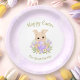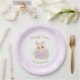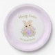 Platos de papel de Brunch y Huevo de Pascua con el conejito más lindo de Pascua sosteniendo un huevo de Pascua en púrpura y verde claro. Borde texturado púrpura. Personaliza fácilmente el texto o déjalo en blanco - Kate Eden Art.