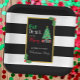 Eat, drink and be merry holiday party featuring a Christmas tree and gifts against a gold frame. Black and white striped background with holly