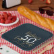 Celebra tu 50 cumpleaños con estilo con estos fabulosos efectos azules, blancos y dorados, elegantes y contemporáneas etiquetas de cumpleaños de la tipografía. Un diseño moderno con texto de guión y gráficos en negrita. Cambie el número a personalizar. Parte de una colección. El número se puede personalizar, ideal para las celebraciones de cumpleaños 21, 30, 40, 50, 60, 70, 80, 90, 100.