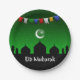 Eid Mubarak saluda al ilustracion con una guirnalda festiva y colorida en una escena nocturna mágica con una silueta de mezquita y la luna y estrellas en un cielo nocturno verde.