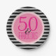 Placas de papel rosadas y negras de la mujer las quincuagésimas de cumpleaños de la fiesta en rosas fuertes y rayas blancos y negros. Lee 50 y fabuloso en rosas fuertes y negro en un círculo rosado con un pálido - frontera rosada. Fondo blanco y negro rayado. Fuentes del cumpleaños de la diversión para las divas 50 años. Otras 50.as fuentes fabulosas de la fiesta de cumpleaños están en nuestra tienda Zazzle/angela65.