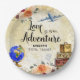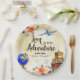 Traveling Love es un plato de ducha de novia aventura. El diseño presenta equipajes vintage, globo, avión, pasaporte y diseño floral acuático. Ducha nupcial con temática de viajes.
