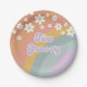 Dos platos de cumpleaños Groovy Retro Rainbow con margaritas.