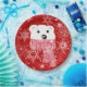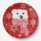 Rompecabezas de oso polar con una bufanda rojiza sobre un fondo rojo con copos de nieve blancos.