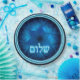 Un diseño elegante con una brillante lectura de texto en hebreo azul y blanco, "Shalom" (ש ל ם - paz), superpuesto a una imagen fractal azul y con aspecto grabado de una estrella de David.
