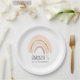 Platos de papel con un ilustracion arcoíris bonito y elegante. Los tonos rosa pastel y el purpurina de oro falso componen este bonito y pequeño diseño de arco iris.