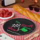 Estas placas de papel son excelentes para cualquier tipo de fiesta de raza con una bandera verde y una bandera de cuadros negros y blancos. Personalice con nombres u otras palabras para su fiesta. El diseño es una bandera de cuadros negros y blancos y una bandera verde con las palabras "El Fiesta empieza aquí". Todo sobre un fondo negro que se puede personalizar a otro color. ¡Hazlo tuyo! Personalizable completo para su fiesta u otro evento. Este diseño es arte original de Phyllis Dobbs.