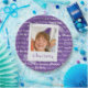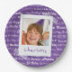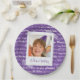 El fiesta púrpura del modelo del feliz cumpleaños embroma las placas de papel personalizadas foto de la fiesta de cumpleaños. El modelo de la escritura blanca "feliz cumpleaños" repitió adentro en un fondo púrpura bonito. Personalizar para cambiar el fondo a otro color. El diseño del marco de la foto de la diversión aparece a grabado a la placa de papel. Nombre del niño escrito en blanco por debajo la foto. Substituya por una foto del niño del cumpleaños. Fuentes frescas y de la diversión modernas personalizadas de cumpleaños de la fiesta para los niños o los adultos.