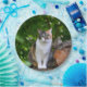 Un gato se sienta en el jardín verde, al lado de un tronco y mira hacia delante