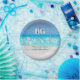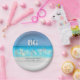 Una hermosa fotografía de una playa de arena blanca impregnada de un gráfico de estrellas y burbujas con aguas azul turquesa cristalinas y un cielo azul soleado en el que aparecen las iniciales de las parejas de novias.