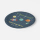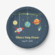 El fiesta de fiesta de bienvenida al bebé temático del espacio lindo suministra las placas de papel que ofrecen los juguetes clásicos del pesebre del bebé con un ilustracion de la torsión del espacio del pacificador de la luna, de la nave del cohete, de la tierra, del planeta y del bebé que cuelga y que substituye los juguetes tradicionales. Las estrellas y los puntos con el fondo azul marino del efecto de la textura hacen el fondo de la galaxia. Personalice con el mensaje del fiesta.