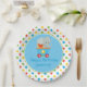 Esta placa del fiesta ofrece un fondo azul rodeado por un golpeteo de repetición de estrellas rojas, azules, amarillas y verdes. Un elefante lindo en un coche de tren azul se sienta en el medio de la placa.