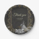 Elegancia en plata y negro. Esta imagen presenta un ilustracion en blanco y negro de un marco boda con intrincados adornos de oro y plata. El marco está decorado con motivos florales ornamentales y una arcada central. Una novia en un vestido de flores, sosteniendo un ramo de flores, se para dentro del marco, mirando lejos del espectador. El fondo es una superficie negra texturada que crea una atmósfera dramática y elegante.