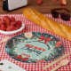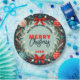 The plate's core features a cheerful "MERRY CHRISTMAS" greeting in a bold red block font and elegant script, set against a soft, muted aqua background. It's fully customizable with your family name curving above and a custom "20XX" date below. Four vintage-inspired Christmas ornaments in red, cream, and turquoise hang from the boughs with delicate ribbons, adding a sparkling touch. The entire design is expertly grounded by a deep navy outer rim, offering a sophisticated and stunning contrast to your holiday treats. Personalize this plate for a stylish and unforgettable holiday gathering.