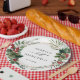 Classy paper plates featuring a delicate gold geometric frame encircling a lush watercolor wreath adorned with vibrant red berries, and greenery.