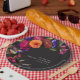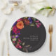 Abraza la belleza opulenta de una cosecha floral de otoño con nuestros cautivadores platos de papel redondos para brindis de boda. Un fondo negro dramático y suave proporciona el lienzo perfecto para un ramo de flores increíblemente realista. Imagina una explosión vibrante de color, con rosas en naranja y magenta oscuro, junto con pequeñas flores rosadas magenta y violetas púrpuras, y junto a crisantemos melocotón y otras flores vibrantes. El follaje verde oscuro y exuberante completa la disposición, agregando un toque de elegancia natural. Este diseño cautivador es perfecto para cualquier temporada, reflejando la intensidad apasionada de tu historia de amor. Los detalles de tu evento aparecen en una fuente blanca limpia y moderna, lo que garantiza que se destaquen hermosamente contra el dramático fondo. Este diseño encantador crea un diseño verdaderamente inolvidable para celebrar tu día especial.