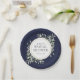 Con hojas de vegetación delicadas pintadas a la acuarela sobre un fondo azul marino, estos platos de papel para baby shower botánico elegante se pueden personalizar con la información de su baby shower especial. Diseñado por Thisisnotme©