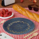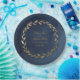 Una elegante y tradicional rama de olivo fletó un plato de papel boda con sus nombres dentro de una corona dorada de rama de olivo con su fecha boda numérica sobre un fondo de color azul marino.
