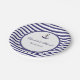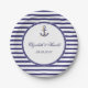 Personalizar este elegante diseño de placa de papel de la Marina Boda Náutica. Diseño de patrón a rayas azul y blanco con un ancla de barco de la marina en la parte superior y un borde de cuerda azul y blanco.El patrón a rayas azul marino y blanco también se coloca en la parte posterior. Una plantilla para una fácil personalización de los detalles de su boda, como los nombres de novios y novios, así como la fecha del boda.El mismo diseño está disponible en otros suministros fijos de boda para llevar el tema del boda náutico con estilo.