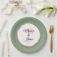 Personalizar estos elegantes platos de papel dorado verde sabio y subió con un toque especial. Este moderno diseño presenta los nombres de la novia y del novio, la fecha del boda, una palmera artística y un elegante círculo de Relieve metalizado de cobre rosa metálico sobre un sabio fondo verde. Si necesita ayuda o elementos coincidentes, por favor contáctame.
