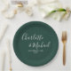 Elegantes platos de papel de boda verde esmeralda personalizados con nombres de estilo y su fecha especial de boda. Diseñado por Thisisnotme©