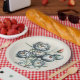 Un ramo de flores muy bien ilustrado. Las flores predominan en los tonos verdes y grises, con detalles complejos que resaltan los pétalos y estambres. Hay un claro brote rojo en uno de los tallos, que contrasta maravillosamente con los tonos fríos del resto. Las hojas y tallos se representan con diferentes matices de verde, dando profundidad y dimensión a la composición. El conjunto está colocado sobre un fondo blanco, lo que permite que los colores de las flores aparezcan y que los detalles sean claramente visibles.