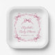 Platos de papel cortos para la ducha de una niña, con un marco rosado de delicadas cintas acuáticas y arcos de coqueta, que combinan una estética mínima con un toque de encanto vintage. Las palabras "Baby Shower" y el nombre de la futura madre se muestran en un elegante guión rosado.