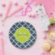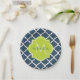 Elegantes placas de papel con estampado azul marino con una insignia de vieiras en un verde de primavera vibrante que puedes personalizar añadiendo tu nombre y monogramado inicial a. Forma parte de la colección Sailor Blue and Lime Punch Spring.