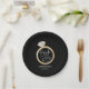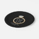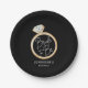 Celebre a la futura novia con estos hermosos, modernos y elegantes platos de papel para fiesta de boda. Con un anillo de compromiso dorado simple y hermoso con letras blancas sobre fondo negro. Artículos coincidentes en nuestra tienda Cava Party Design.